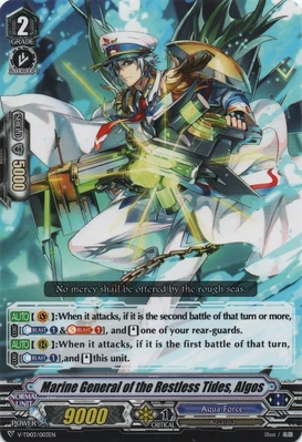 Ở ô Rear guard (RC) nếu đánh xong Wave 1 với cái giá là 1 Counter Blast Algos có thể tự Restand mình và đánh tiếp để tạo nên Wave 2 còn nếu ở ô Vanguard (VC) nếu đánh ở Wave 2 Algos có thể trả cost để Stand lại 1 trong những người lính của mình để tạo thành Wave 3 . Dù ở vị trí nào thì Algos cũng thực hiện tốt nhiệm vụ của mình khi vừa có khả năng tự tạo Wave đồng thời kích hoạt kỹ năng của đồng đội , Algos còn cực kỳ đáng sợ khi đây là 1 Unit Grade 2 khi bạn có thể ride lên sớm để gia tăng áp lực trận đấu từ những phút đầu và điều tuyệt vời nhất là gì ? Algos có tận 4 COPY !!! trong Trial deck giúp bạn dễ dàng trong việc build deck.