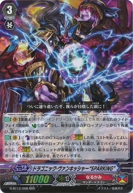 [CONT](RC) Thunderstrike 5 (This ability is active when your opponent’s bind zone has five or more cards):During your turn, this unit gets [Power]+9000, and “[ACT](RC)[1/Turn]:[Counter Blast (1)] If you have a vanguard with “Vanquisher” in its card name, choose one of your opponent’s (RC), and until end of turn, when this unit attacks a vanguard, this unit battles both the vanguard and the units on the chosen (RC).”.