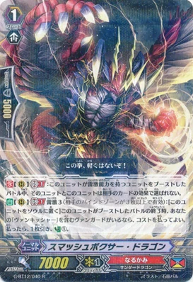 Narukami nổi tiếng với những đòn đánh Power cực cao nhưng những kẻ phá bĩnh kể trên sẽ khiến cho mọi cố gắng của các bạn trở về con số 0 và Smash Boxer Dragon sẽ là câu trả lời cho chúng , sau khi hoàn thành xong nhiệm vụ bạn có thể biến Smash Boxer thành 1 soul ,1 card ,counter charge ( nếu đối thủ của bạn ko thuộc clan những card kể trên).