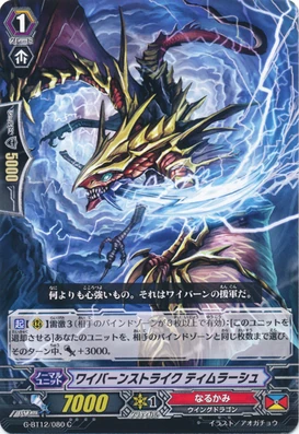 [AUTO](RC) Generation Break 1 Thunderstrike 3 (This ability is active when your opponent’s bind zone has three or more cards):[Put this unit into your soul] At the end of the battle that this unit boosted, if you have a vanguard with “Vanquisher” in its card name, you may pay the cost. If you do, draw a card, and Counter Charge (1).