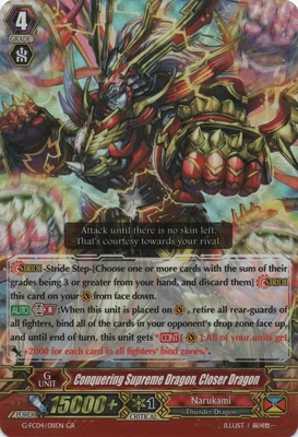 [ACT](VC)[1/Turn]:[Choose a face down card named “Conquering Supreme Dragon, Dragonic Vanquisher “VOLTAGE”” from your G zone, and turn it face up] Until end of turn, this unit gets “[AUTO](VC):When this unit’s attack hits a vanguard, your opponent chooses one of his or her rear-guards, retires it, and you choose up to two cards from your opponent’s drop zone, and bind them face up.” and “[CONT](VC) Generation Break 3:During your turn, all of the units in your front row get [Power]+3000 for each card in your opponent’s bind zone.”.