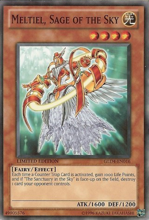 Với 1 effect khá đơn giản là heal 1000LP khi bạn activate Counter Trap, Meltiel sẽ chỉ như 1 Dian Kento bản monster. Nhưng điều làm cho nó trở nên khá khó chịu vào thời xưa đó chính là phần effect activate khi có “The Sanctuary in the Sky” trên sân, nó sẽ được destroy 1 card của opp MÀ KHÔNG TARGET.