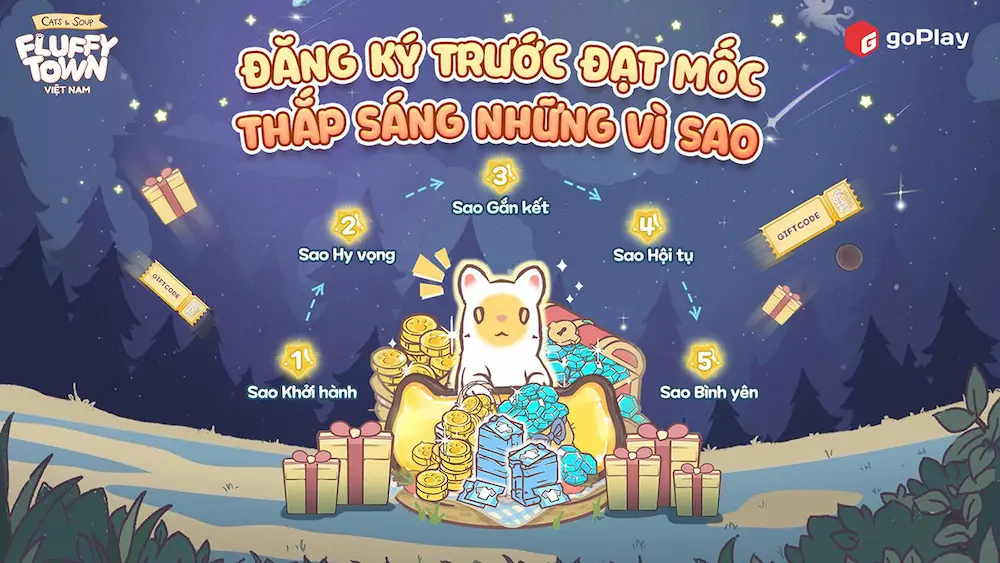 Ngay trên trang landing đăng ký, game thủ Việt có thể cùng nhau “Thắp sáng bầu trời Fluffy Town” thông qua 5 mốc sao đặc biệt. Mỗi ngôi sao tương ứng với một mốc đăng ký sớm và sẽ mở khóa phần thưởng Giftcode chung cho toàn bộ người chơi.