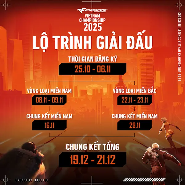 Crossfire: Legends Vietnam Championship 2025 sẽ được tổ chức với 2 giai đoạn, theo khu vực và chung kết tổng. Mốc thời gian của giải sẽ trải dài từ đây đến sau giai đoạn Open Beta của game, cụ thể: