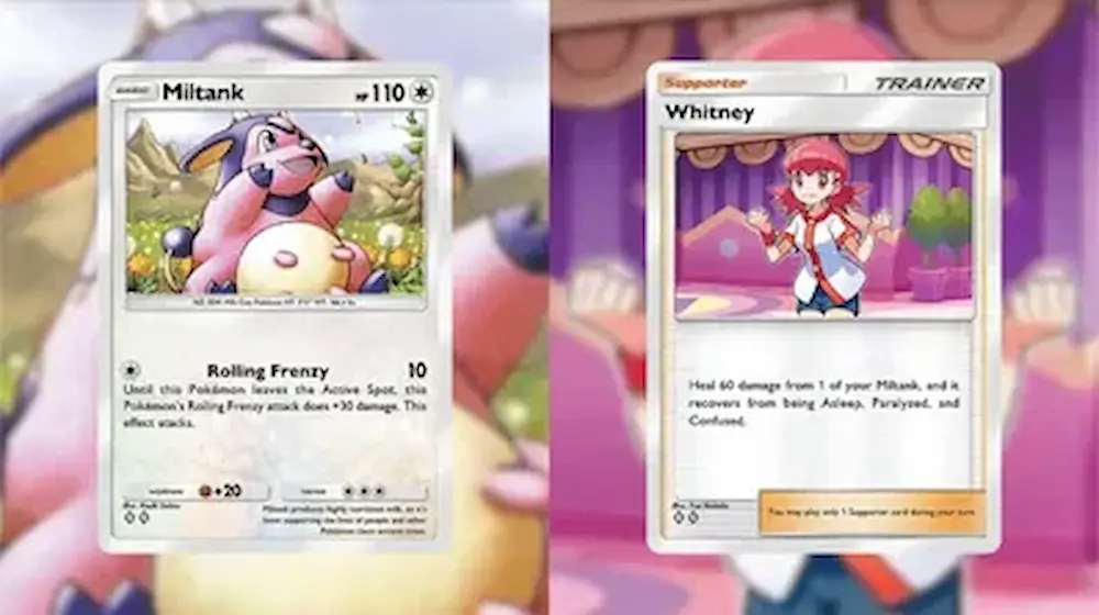 Các bộ bài xoay quanh Miltank thường chỉ tập trung vào duy nhất lá này, từ đó nhường chỗ cho hàng loạt thẻ Hỗ trợ giúp duy trì sức sống và kiểm soát trận đấu. Những lá thường thấy là Whitney (hồi phục và loại bỏ trạng thái bất lợi), Giant Cape (tăng HP từ 110 lên 130), cùng nhiều card hỗ trợ như Sabrina, Cyrus hay Guzma để xoay chuyển thế trận. Mục tiêu duy nhất: giữ Miltank sống càng lâu càng tốt để sát thương tích lũy phát huy tối đa.
