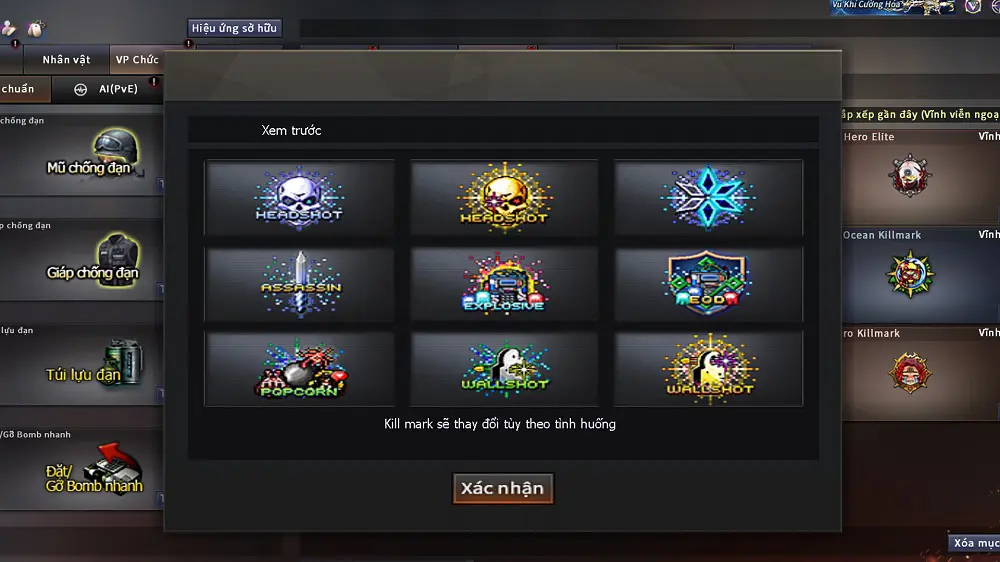 • Hộp tùy chọn vũ khí, cho phép người chơi chọn 1 trong 4 món: